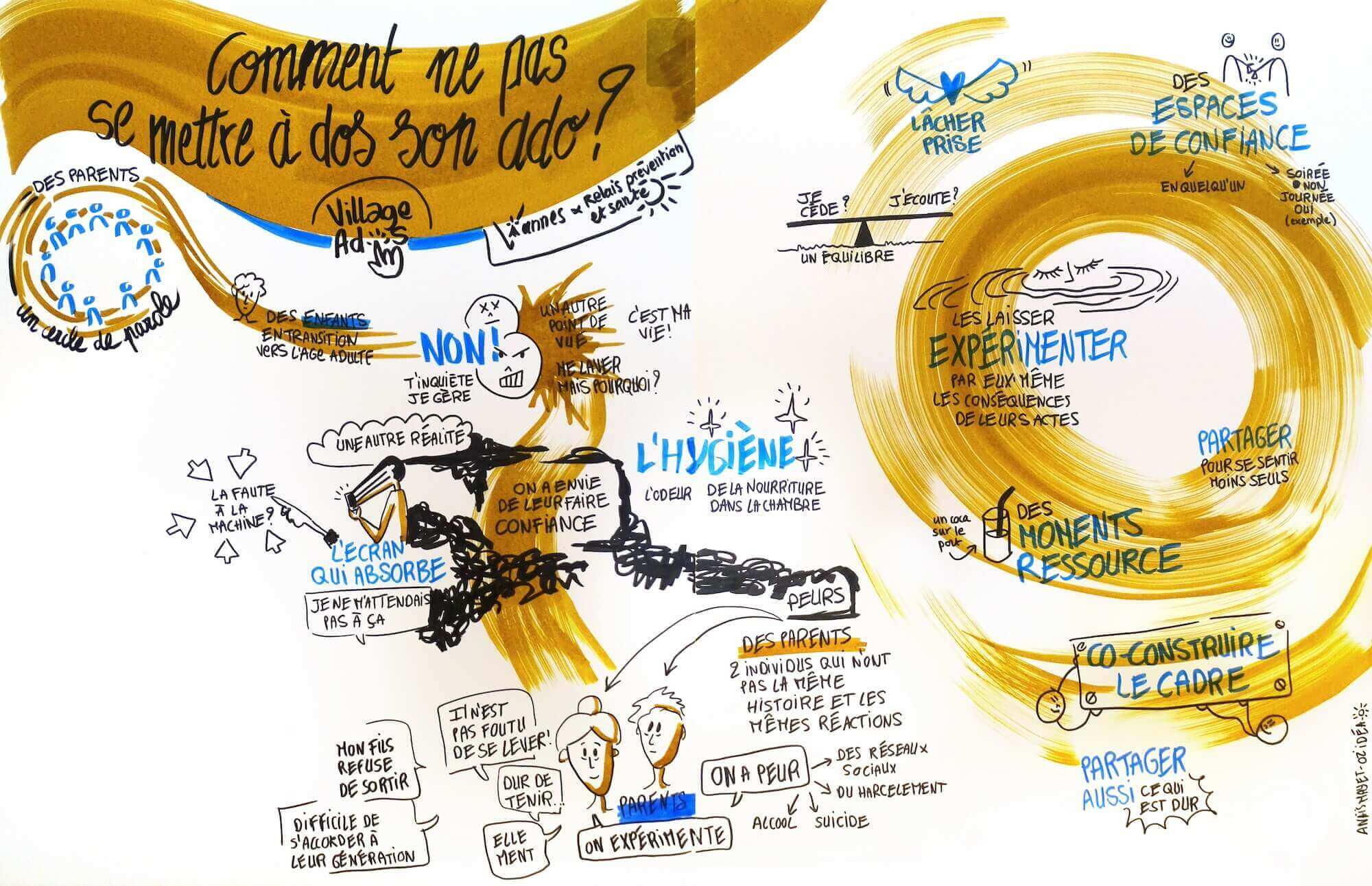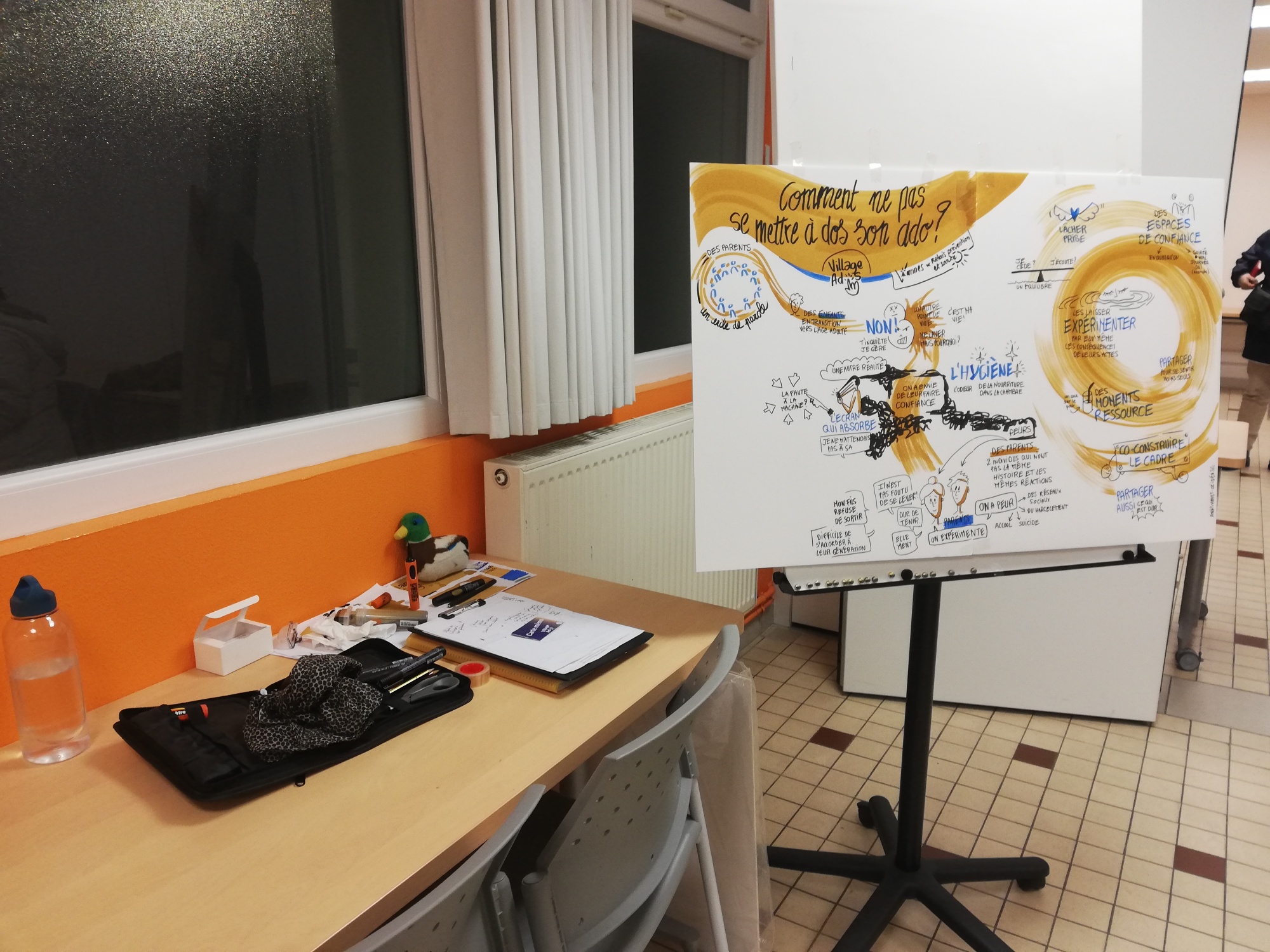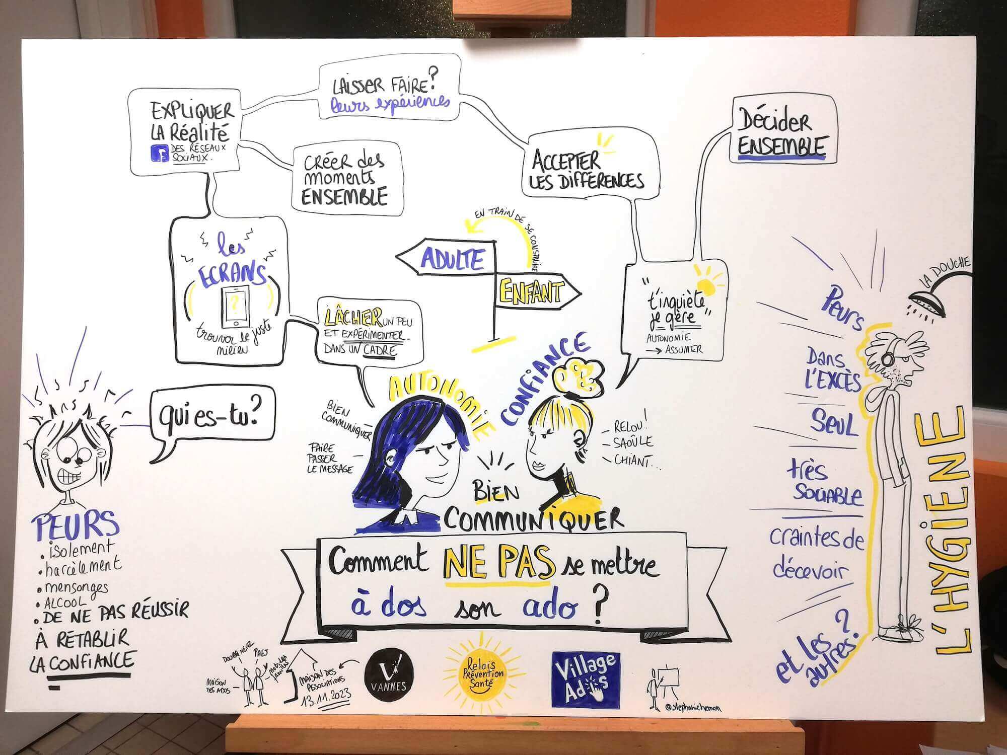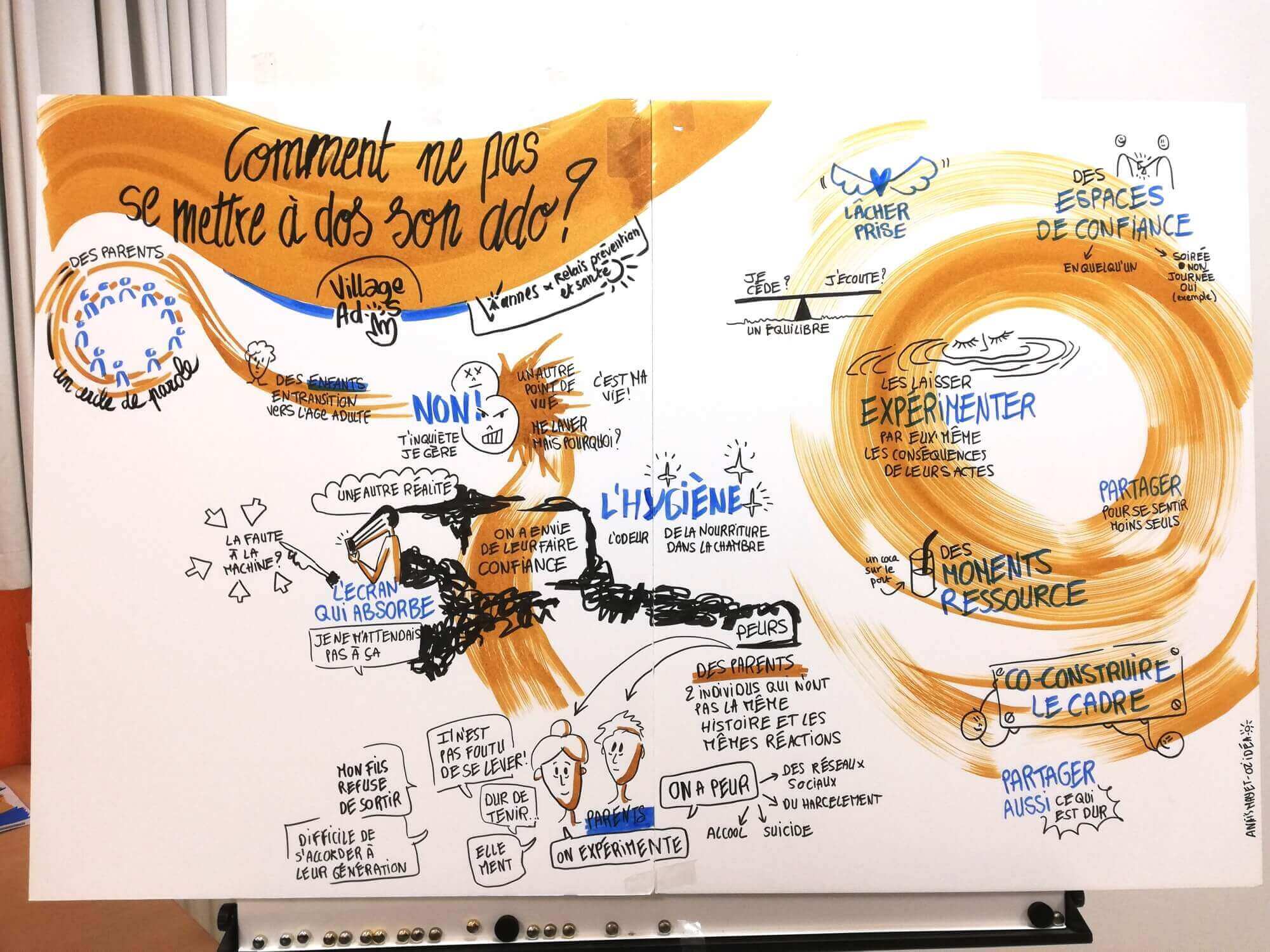 Suite à l'annulation d'un des ateliers prévus, nous nous sommes finalement retrouvées à 2 facilitatrices graphiques, Stéphanie Hémon et moi même, pour le même atelier.