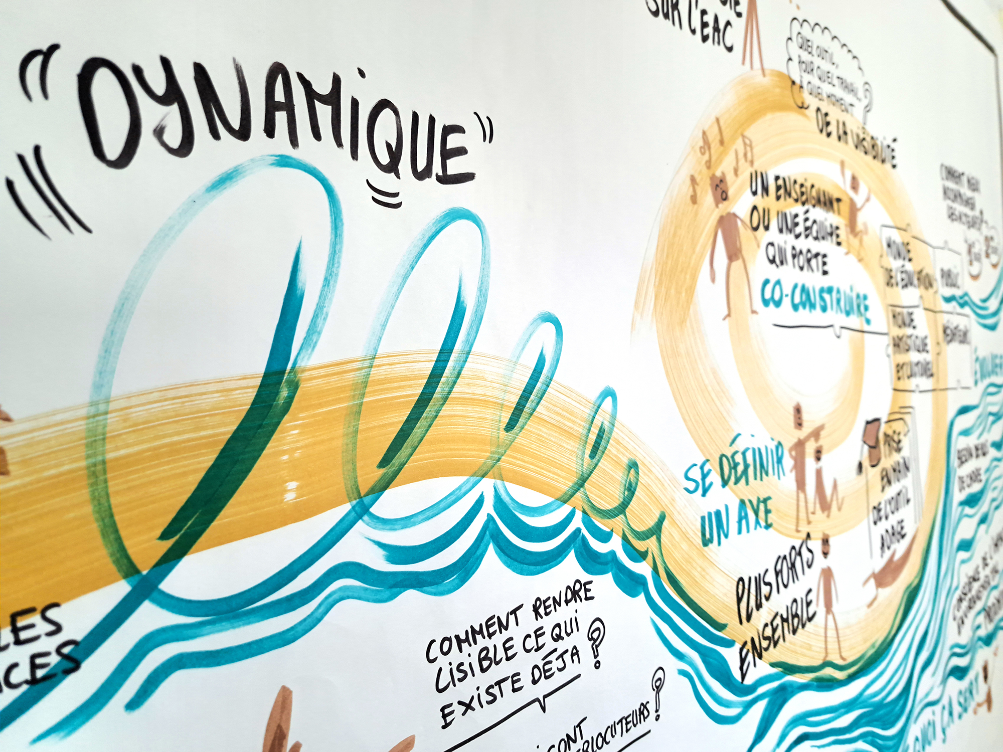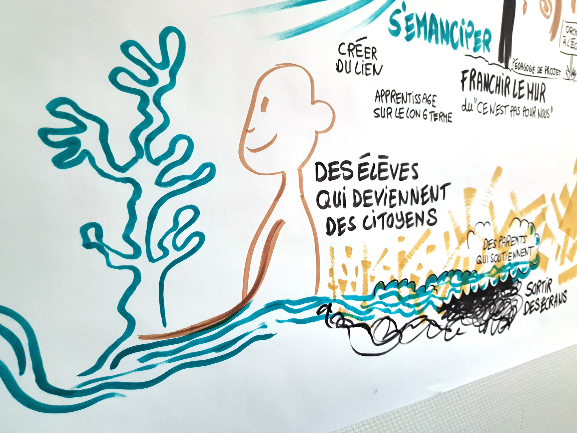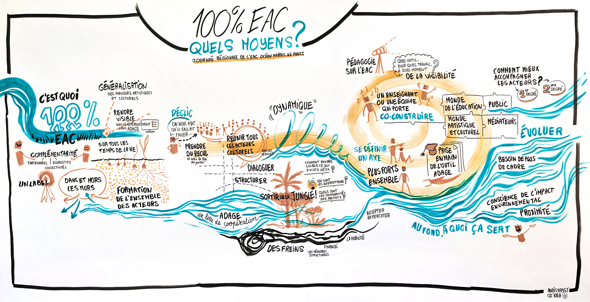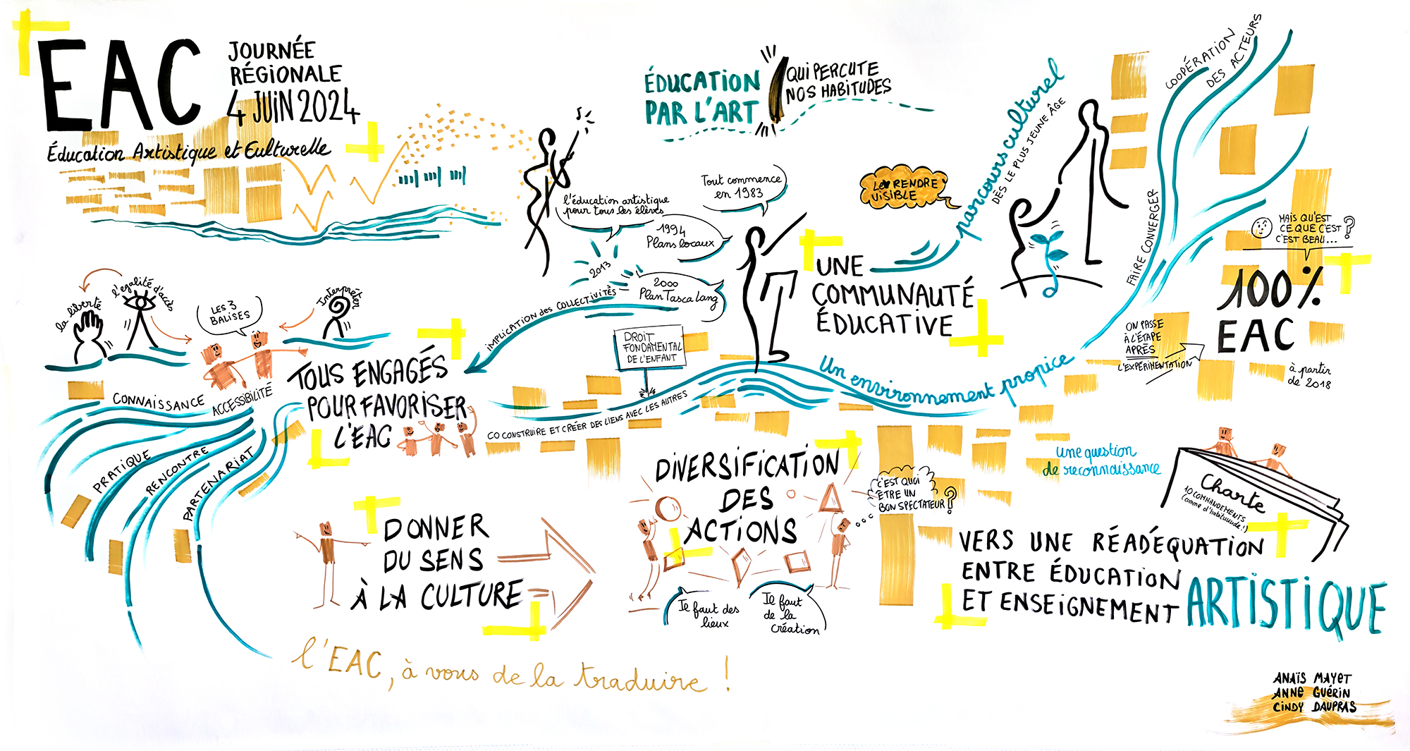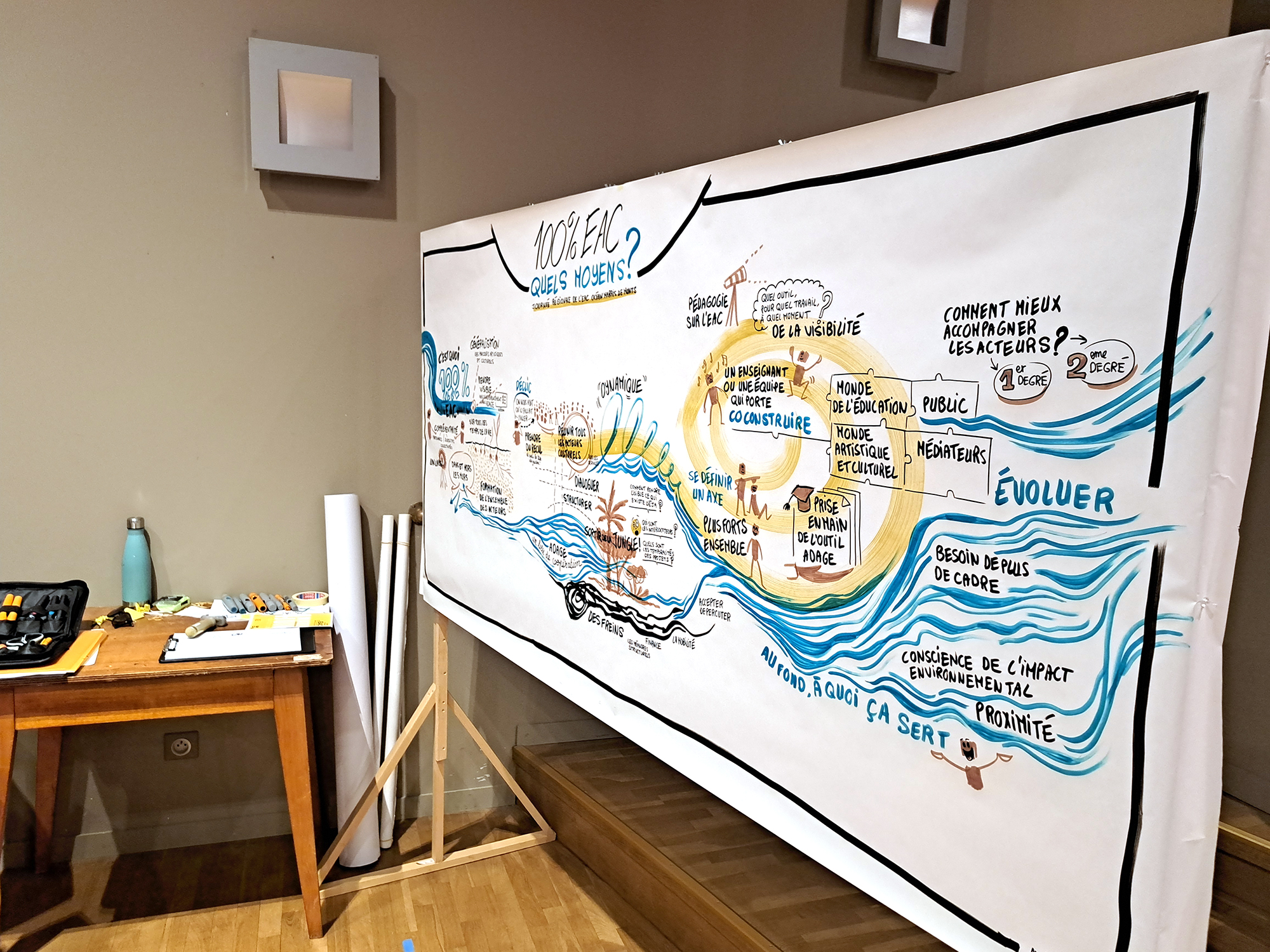 J'ai aimé dessiner les échanges de ces acteurs de l'éducation artistique et culturelle en Pays de la Loire, des personnes issues de la culture, de l'art, de l'éducation et de l'enfance jeunesse. Et quel plaisir d'avoir pu expérimenter la création d'une fresque à 3 mains avec mes conseurs Anne Guérin et Cindy Daupras, une première pour nous !