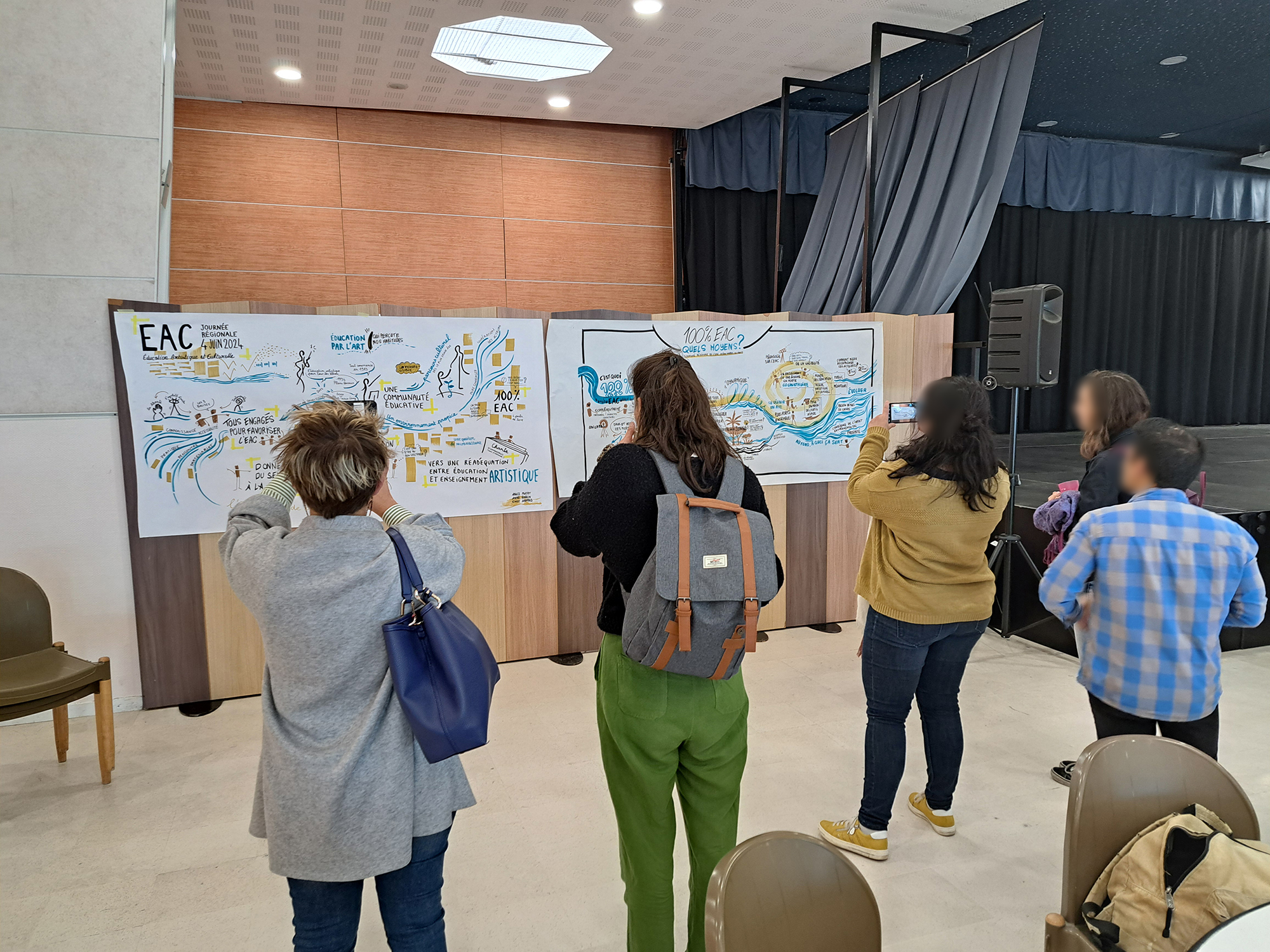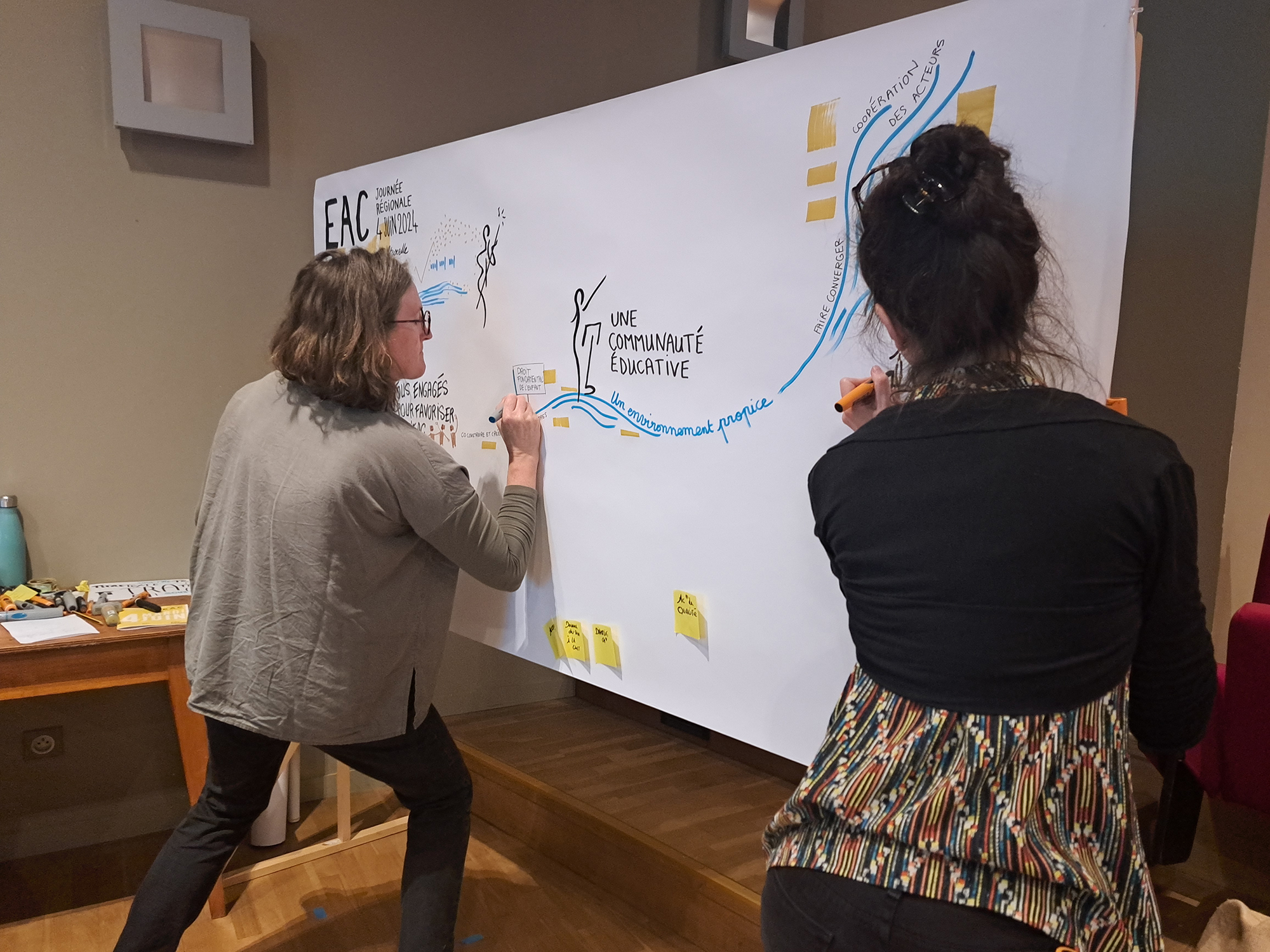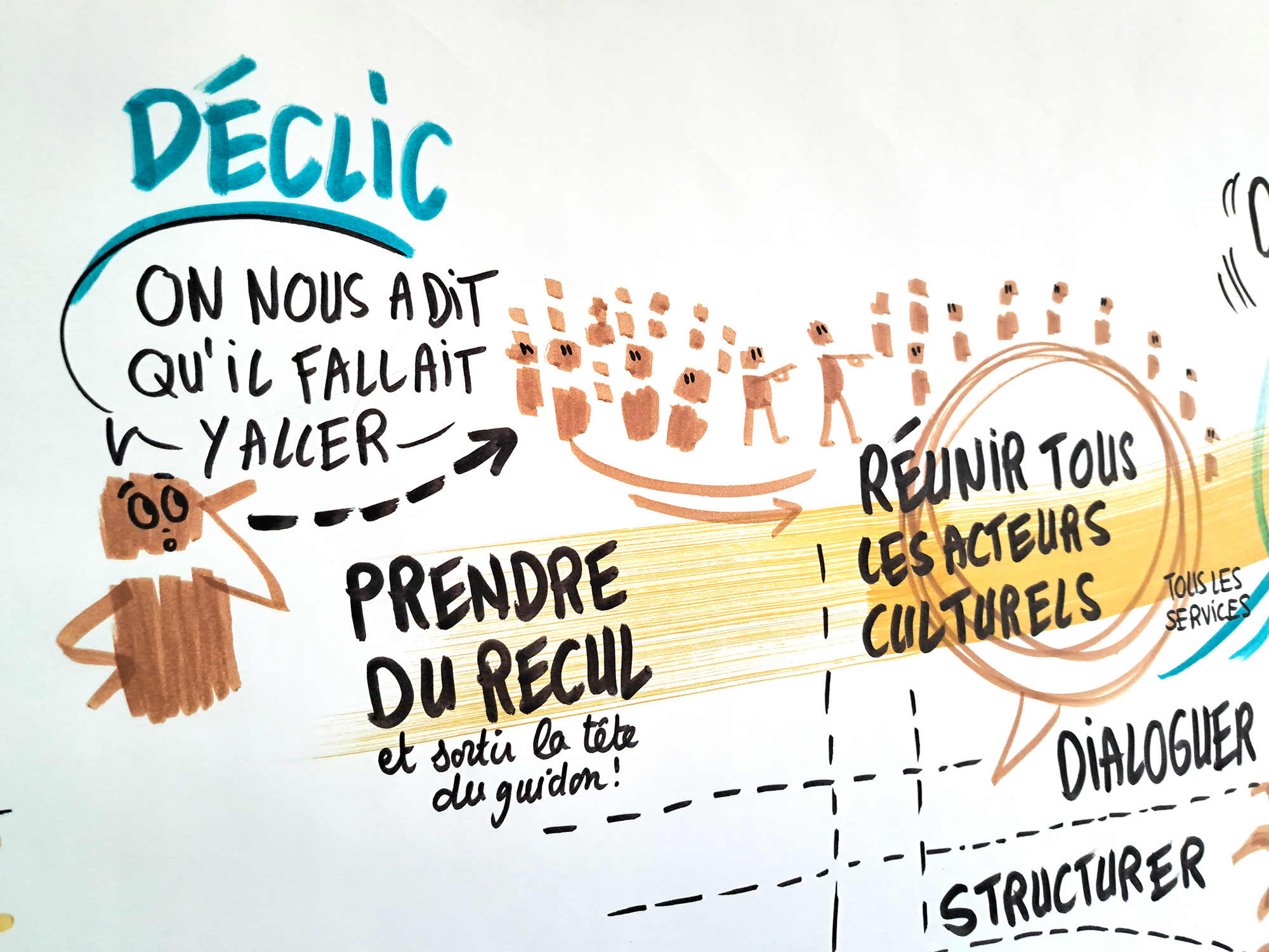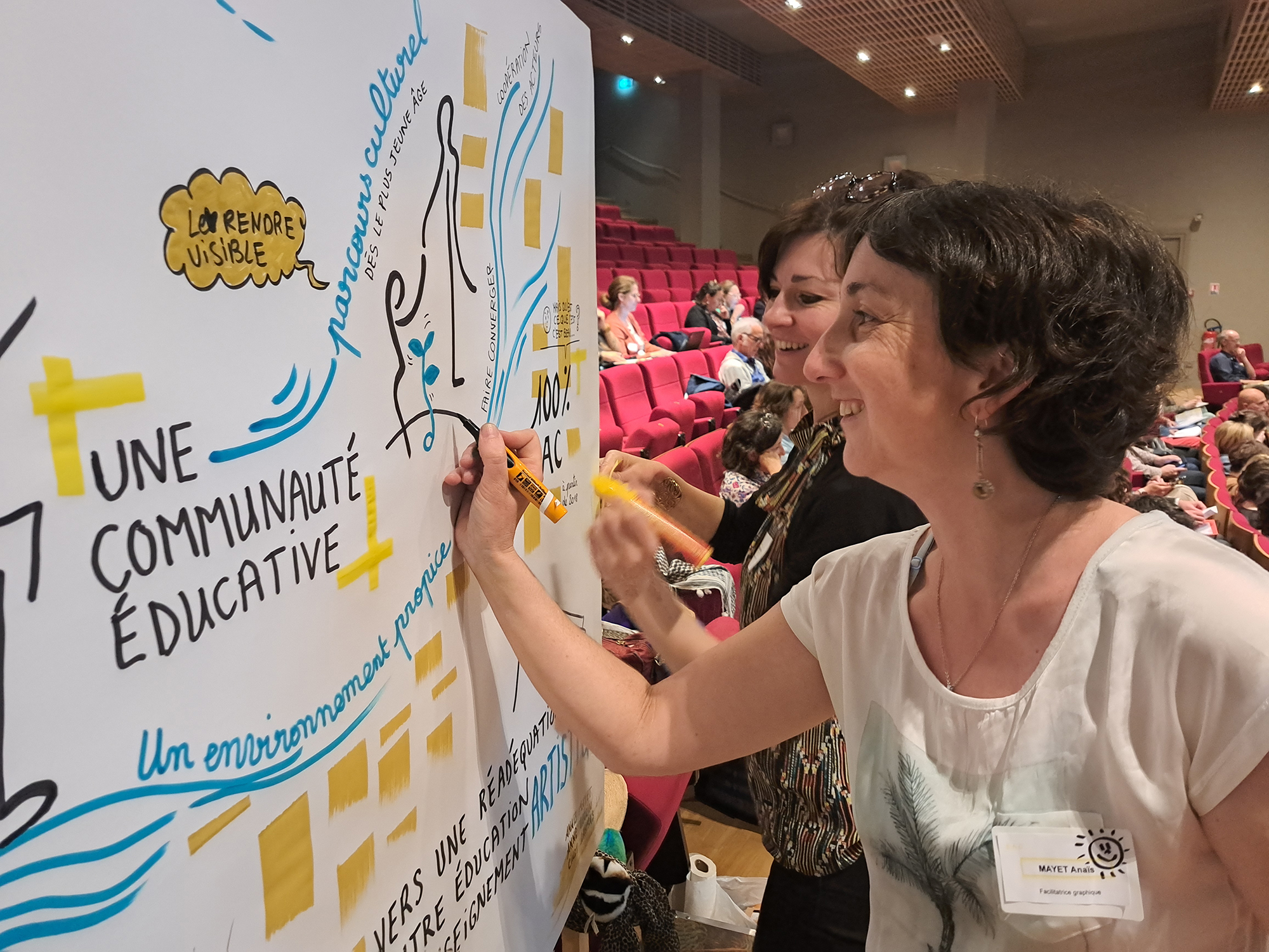 J'ai aimé dessiner les échanges de ces acteurs de l'éducation artistique et culturelle en Pays de la Loire, des personnes issues de la culture, de l'art, de l'éducation et de l'enfance jeunesse. Et quel plaisir d'avoir pu expérimenter la création d'une fresque à 3 mains avec mes conseurs Anne Guérin et Cindy Daupras, une première pour nous !