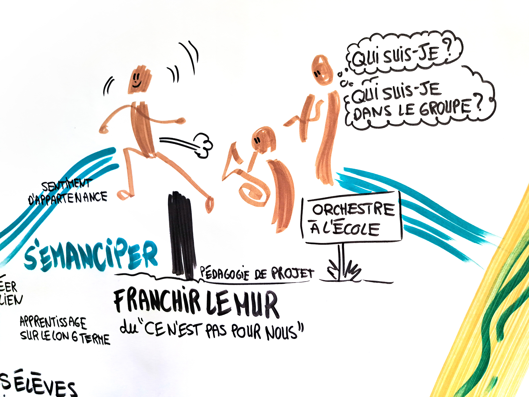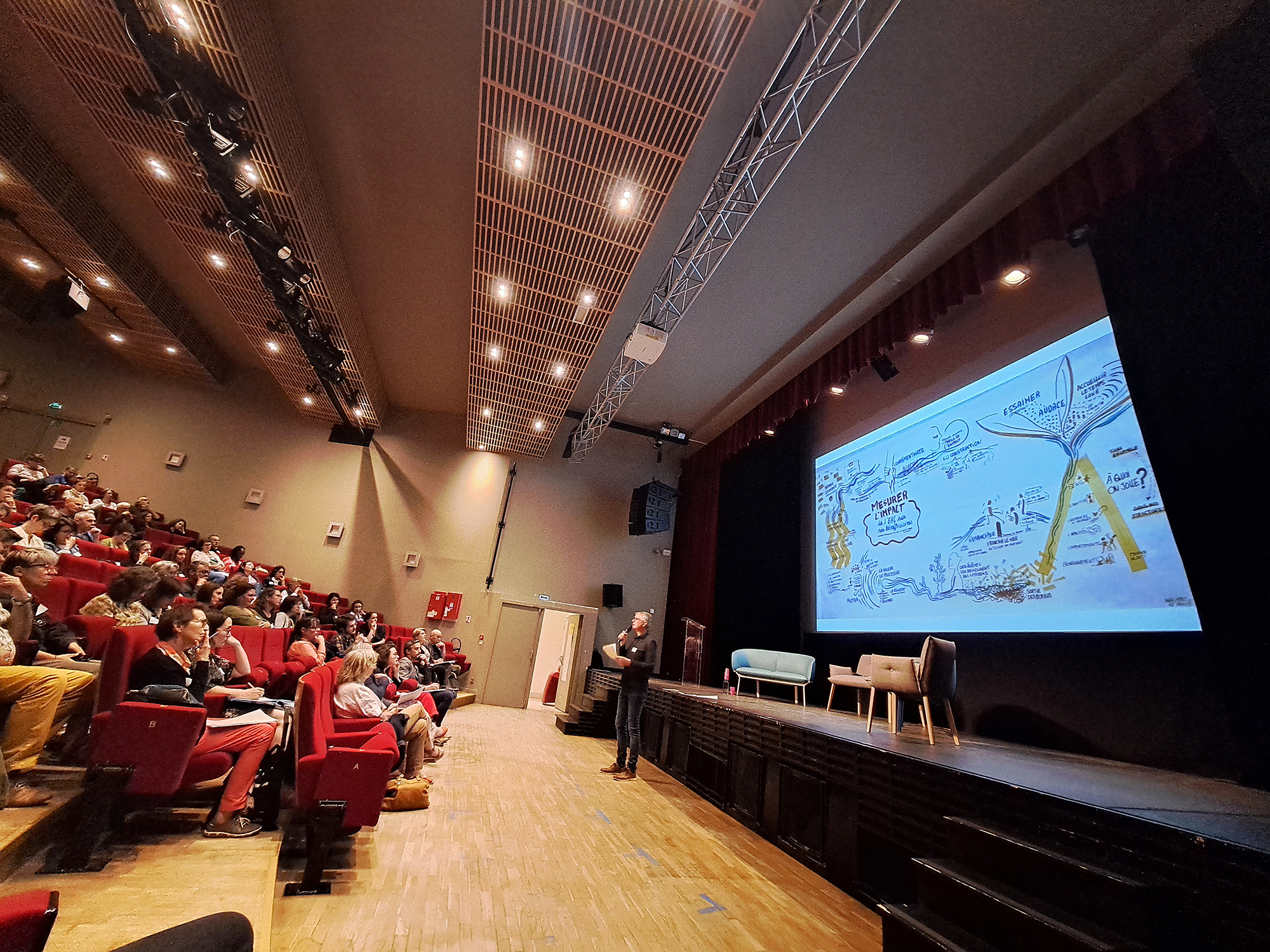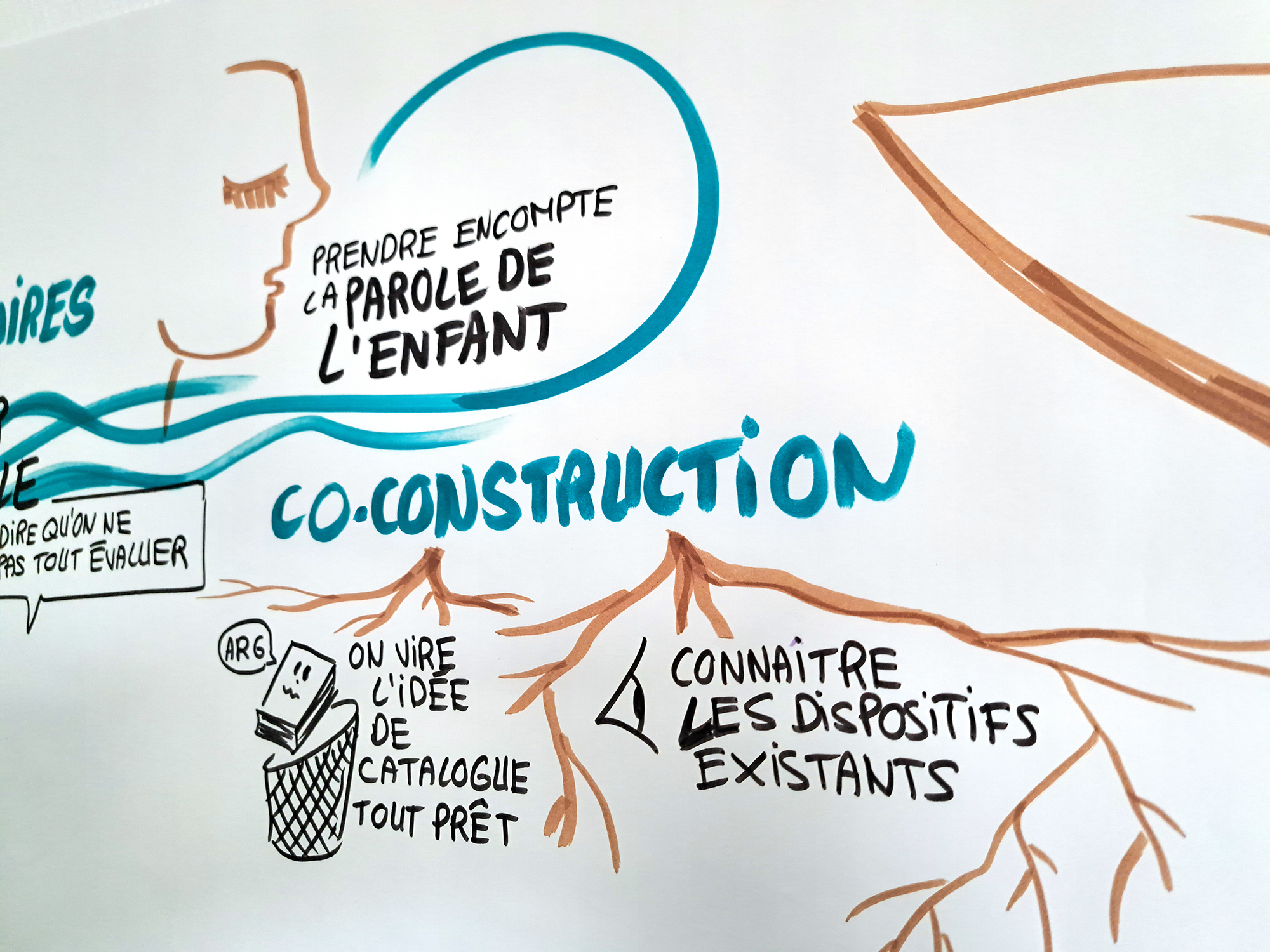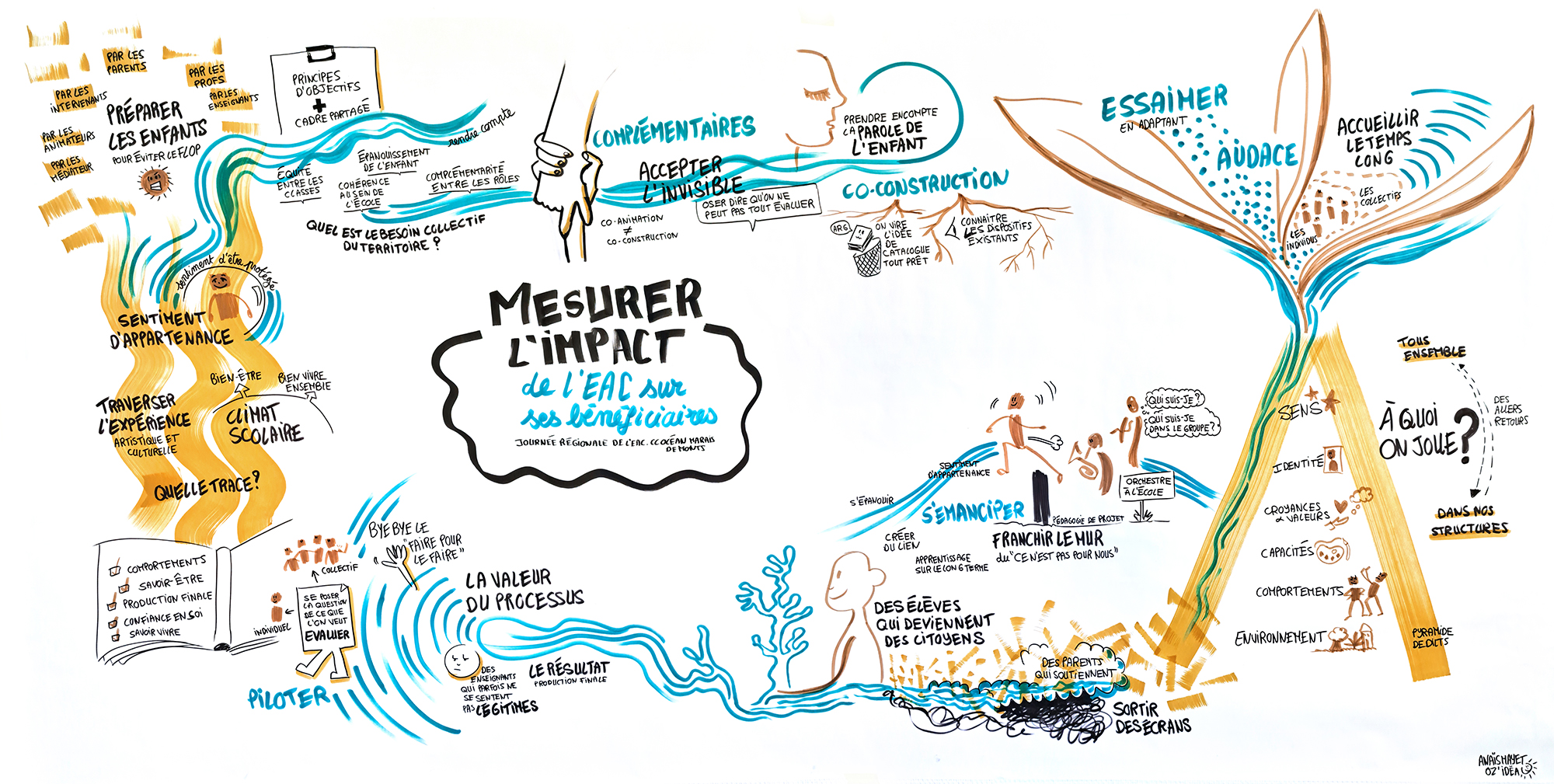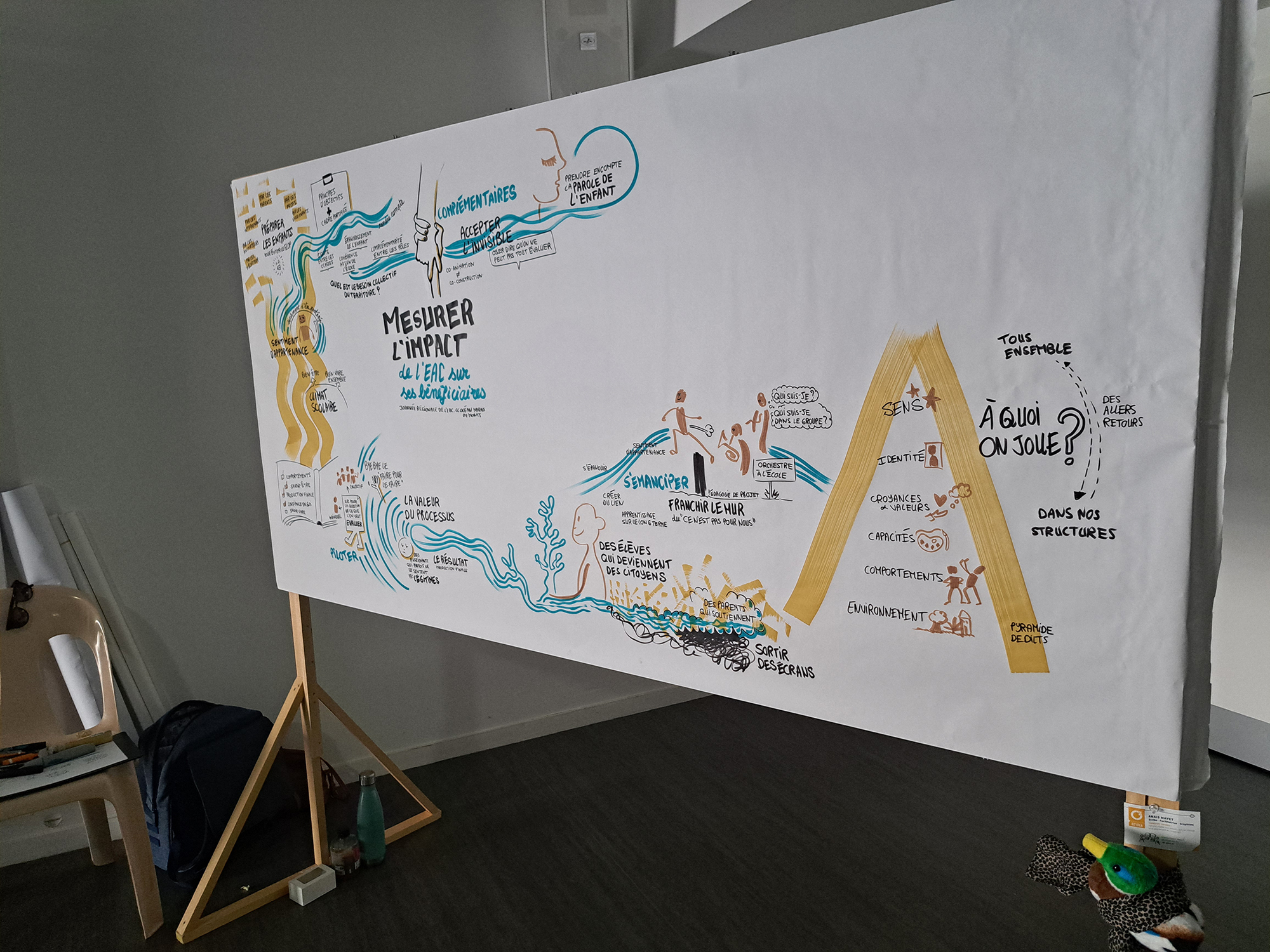 J'ai aimé dessiner les échanges de ces acteurs de l'éducation artistique et culturelle en Pays de la Loire, des personnes issues de la culture, de l'art, de l'éducation et de l'enfance jeunesse. Et quel plaisir d'avoir pu expérimenter la création d'une fresque à 3 mains avec mes conseurs Anne Guérin et Cindy Daupras, une première pour nous !