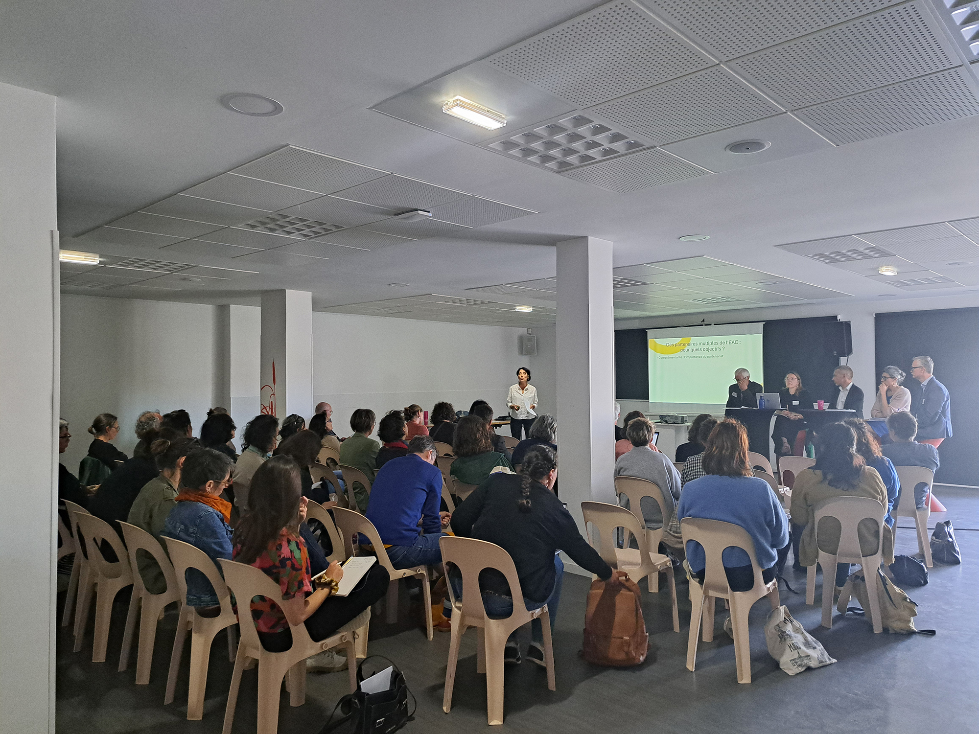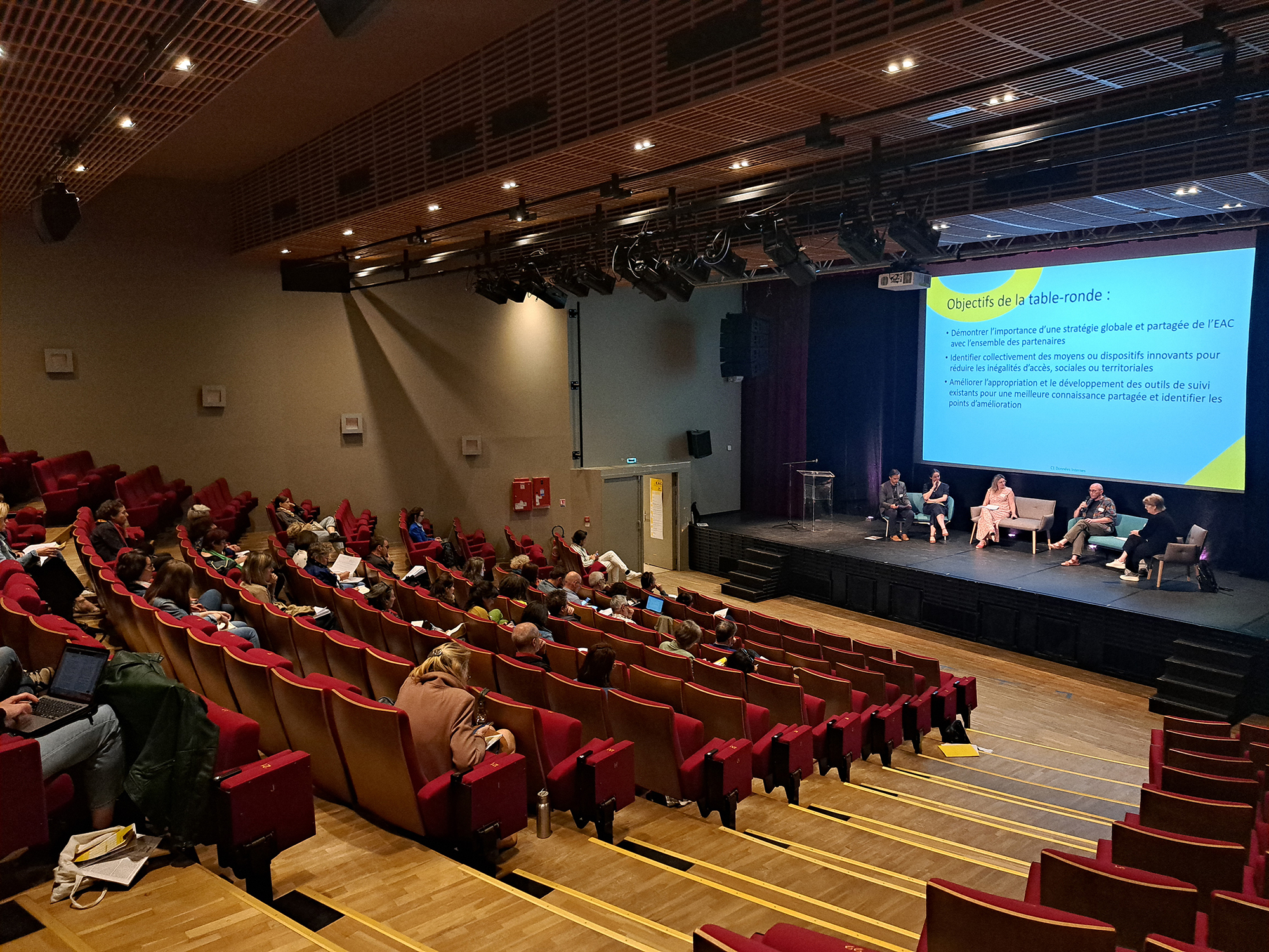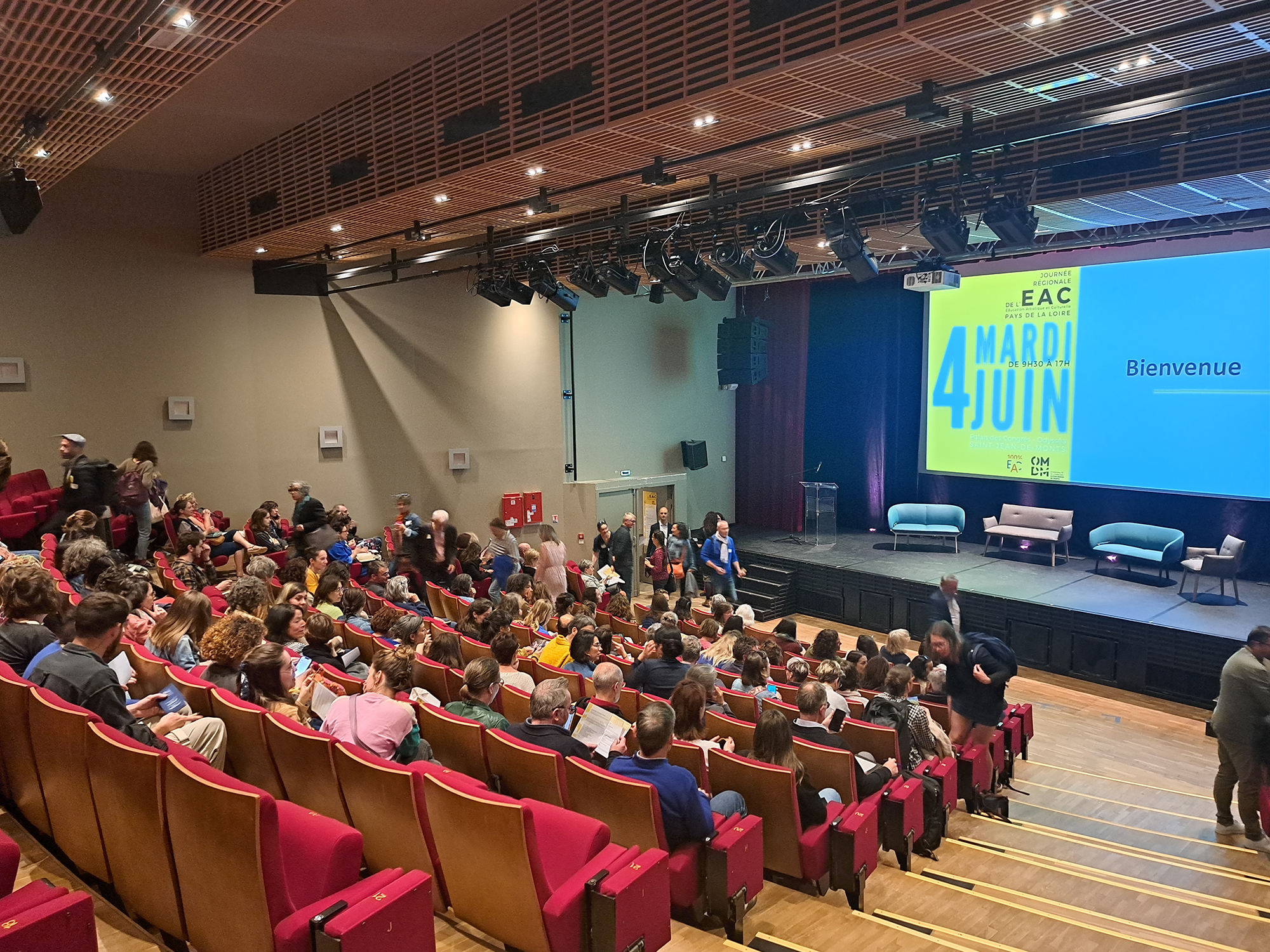 Dans la salle : des professionnels de l'EAC issus des domaines de l'éducation, de la culture, et de l'enfance et de la jeunesse, de la santé, concernés par des projets d'éducation artistique et culturelle.
