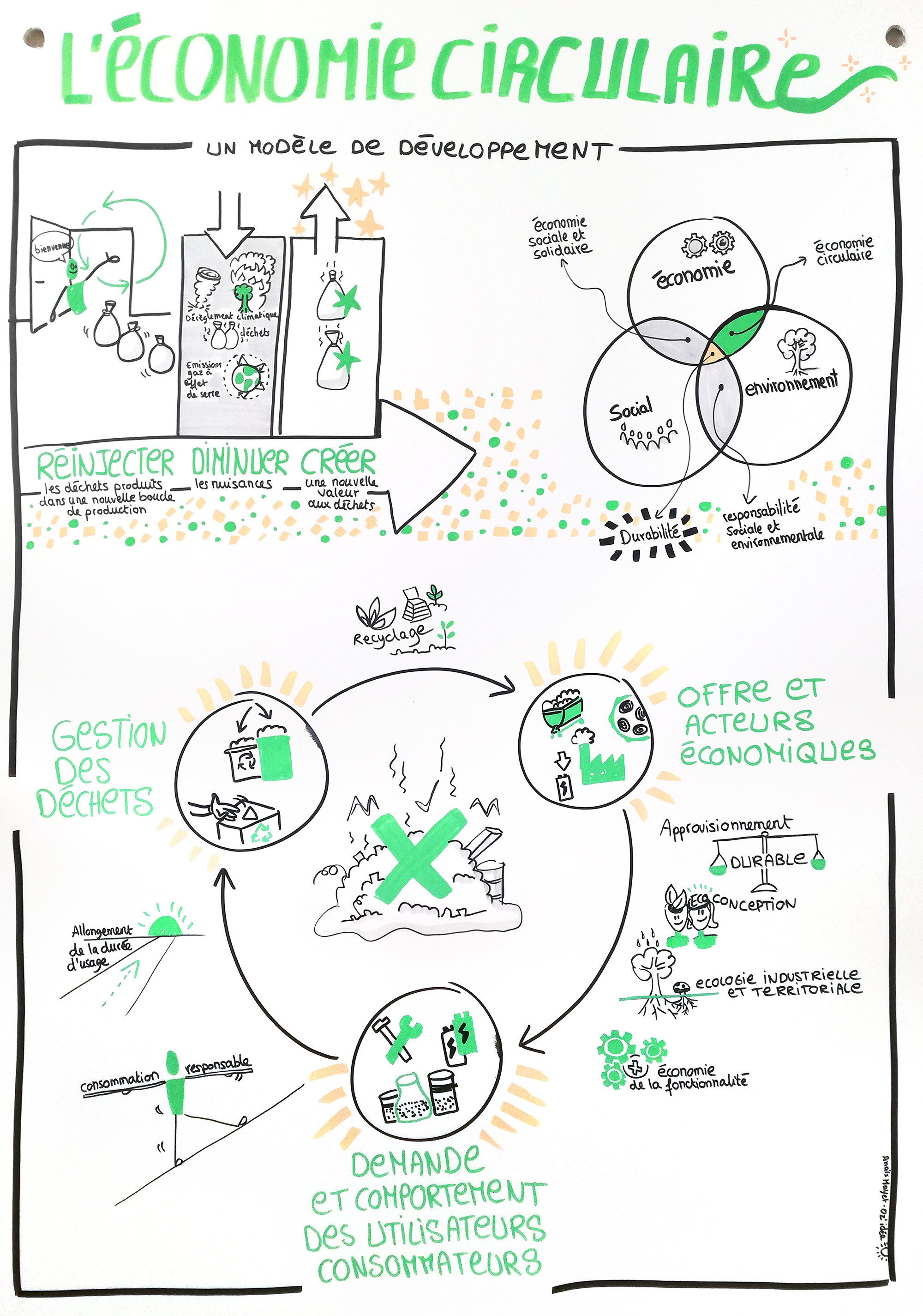 - Un visuel de synthèse sur l'économie circulaire : Modélisation = suggestion d'une organisation visuelle de l'information / schématisation des concepts clés d'après un document fourni + Création du visuel