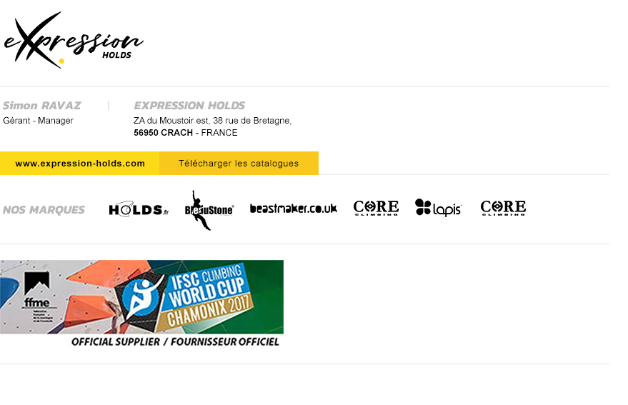 Expression Holds est un designer et fabriquant de prises et volumes d'escalade pour toutes les utilisations : allant du milieu scolaire aux compétitons de Coupe du Monde.